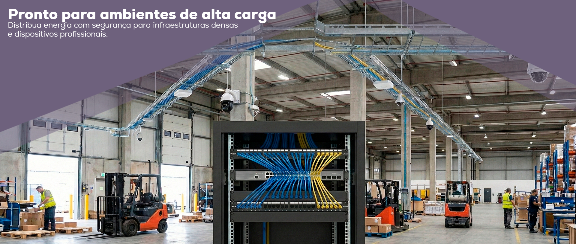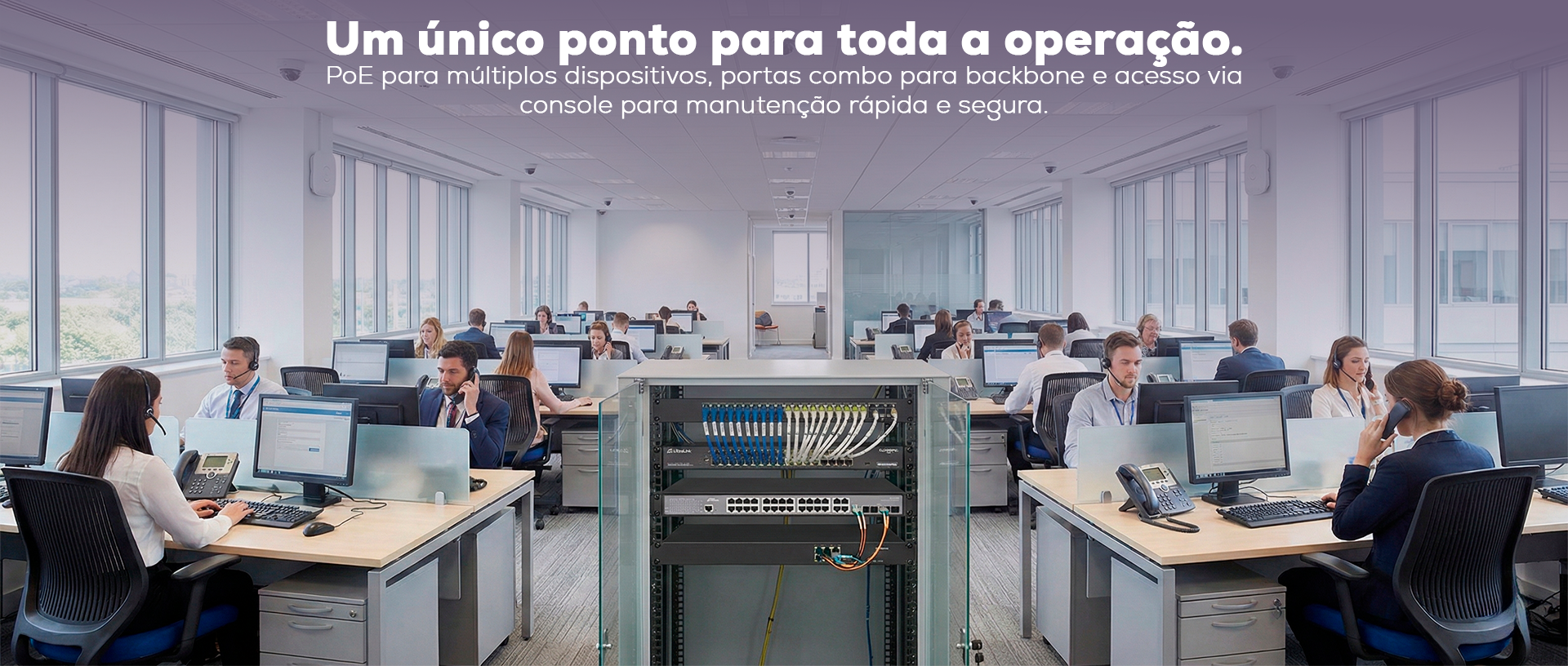 • 28 portas no total: 24x PoE Gigabit, 4x combo RJ45/SFP e 1x Console